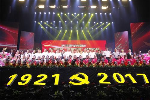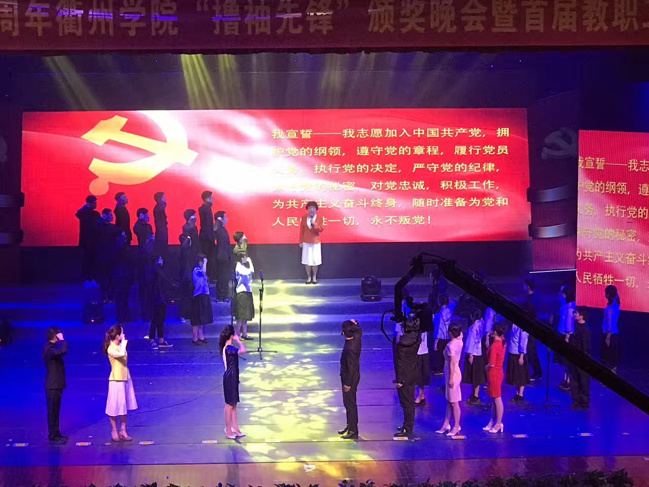6月13日晚,我校大礼堂里人头攒动、流光溢彩、热闹非凡,一千多名师生欢聚一堂,共同庆祝建党96周年,9001cc金沙首页“撸袖先锋”颁奖晚会暨首届教职工文艺汇演。一首首动人的歌曲,一曲曲优美的舞蹈,一次次激情澎湃的朗诵,无不抒发着对中国共产党的满腔热忱,诉说着衢院教职工对学校的一往情深,描绘着对学校未来发展的美好图画…… 衢州市副市长王良春、市委组织部纪检组长张岚、衢州日报报业传媒集团副总编辑毛小明、市广电传媒集团副总裁(副台长)邹华新、市总工会组宣部长宁小华;校长胡伟,校党委副书记张学东、杨政,副校长李长吉、郑文山、吾国强,党委委员、宣传部长吴新强,党委委员、组织部长吴利平等领导与全校1000多名师生一同观看了晚会。 校党委书记胡建新正在杭州出席省第十四次党代会,他专门向晚会发来贺电,祝贺演出圆满成功。