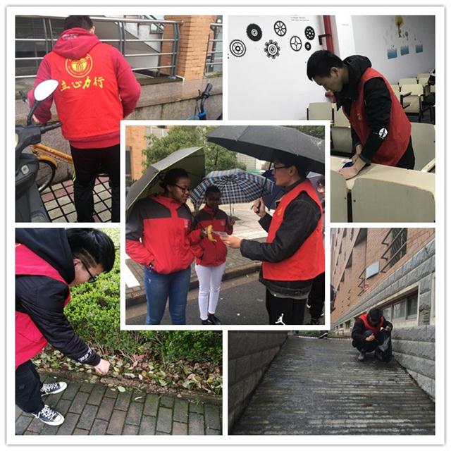 虽然刮着风下着小雨,也丝毫未能降低他们的热情。根据分工,“机动部队”志愿者们分成“单车整治队”、“捡烟头大队”和“雷锋故事宣讲队”三个小组在校园内开展志愿服务活动。他们深入学校各个角落,整理乱停乱放的自行车,仔细清理草坪、路面上的烟头等垃圾,以实际行动号召大家自觉维护校园环境卫生,为创建干净美好的校园环境奉献出自己的力量。对于雷锋的故事,来自南非的国际交流生们也表示十分感兴趣,通过交流,更进一步宣扬了中华民族深厚的人文底蕴及传统美德。