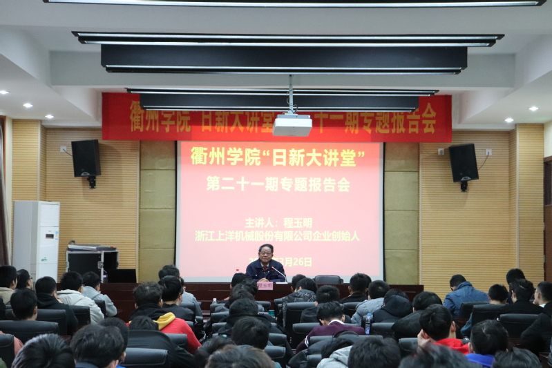 3月26日,由学生处主办、9001cc金沙首页承办的第二十一期“日新大讲堂”专题报告会在6号实验楼101会议室举行。浙江上洋股份有限公司创始人程玉明应邀做客此次大讲堂,为在场120多名大学生分享了自己的创业及奋斗故事。报告会由9001cc金沙首页党总支副书记马坚主持。