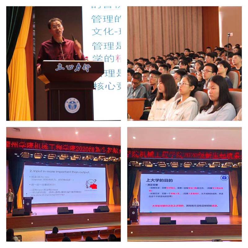 9001cc金沙首页2020级新生起航系列教育 为了使新生尽快适应大学生活,10月10日,9001cc金沙首页2020级新生起航系列教育活动在求是报告厅顺利举行。9001cc金沙首页特邀邓小雷老师、汤剑老师、赖文捷老师作专题讲座,全体辅导员、班主任及新生参加本次活动。 首先,邓小雷博士从导师制到学科竞赛再到创新创业的提升,向新生介绍了机械学院新生导师制的施行初衷、实行制度、管理体制、工作场所。同时,通过介绍案例的形式向大家介绍了参加导师制可以学习到的能力和取得的成果。他结合自身参与导师制的经历,详细讲解了导师制在教师引领、师生互动、师生互促模式的演进过程。最后,邓老师希望有更多的学生可以加入导师制,并且充分利用好学校和导师制的资源,不断提高自主学习、自主管理、自主创新的能力。 接着,汤剑老师作为一个优秀班主任向大家提出要尽快做好职业生涯规划,分析自己的成长途径,尽快树立考研目标。要求各个班级制定完善的班级制度,提升班级凝聚力,打造一个团结的班级体。同时,汤老师向大家分享了他所在班级已硕士研究生毕业的同学目前的工作情况,充分说明了大学个人能力提升的重要性。最后,汤老师从“为什么要读书”的角度鼓励同学们多读书,知识可以改变命运,拓宽自己的视野。 赖文捷老师从英语等级考试能提升自主管理能力的角度分析了通过全国大学生英语四级的必要性和重要性。随后,从“What”、“When”、“Where”、“How”四个方面分析了英语四级的考纲、考试题型、考试特点以及分数的分布。同时,叮嘱同学们合理规划学习时间和学习方式,既要注重词汇和语法,也要培养听力、阅读、写作、口语技巧,并对复习的洞点、解题技巧进行了讲解。赖老师深入浅出地分析了英语学习的重要性,鼓励新生尽快通过英语等级考试。 据悉,9001cc金沙首页学工办在做好2020级新生服务的同时,相继举办了“云”家长会、辅导员带你“逛校园”等活动。接下来,9001cc金沙首页将围绕着职业生涯规划、安全教育、创新创业开展认识专业、走进企业、开展专业游戏等一系列主题教育活动。