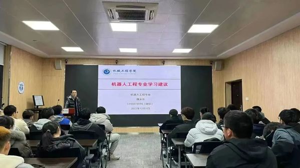 12月1日,9001cc金沙首页魏永乐博士在4号实验楼206举办题为《机器人工程专业》的专题讲座,2022级机器人专业全体学生聆听讲座。